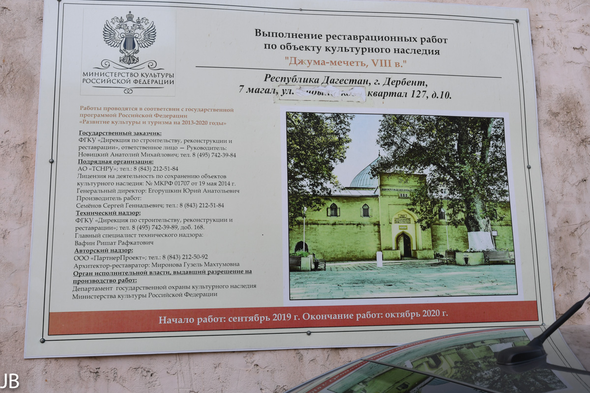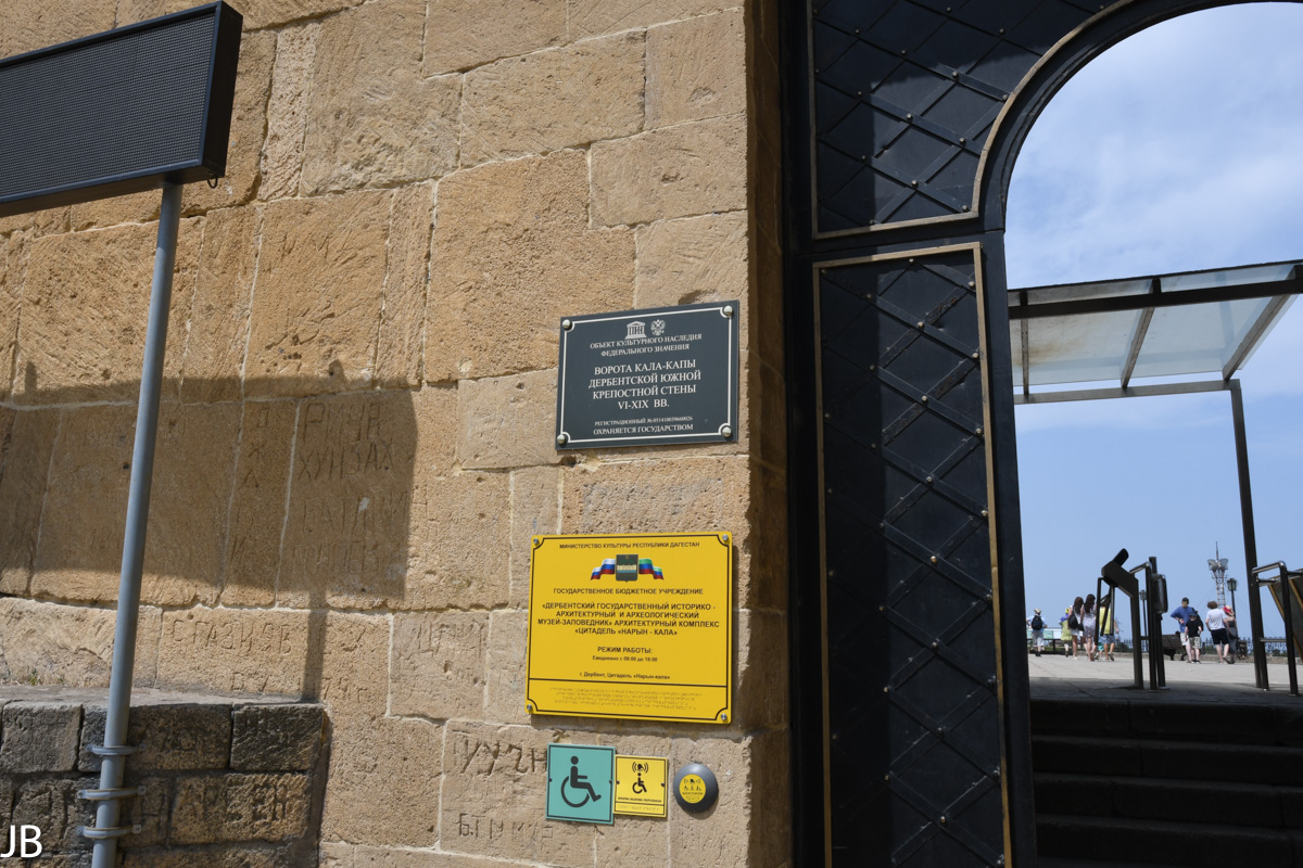 Seit 1989 steht Derbent unter Denkmalschutz. Die Museumsanlage unter freiem Himmel zählt ca. 150 Objekte. Das “Prachtstück” des Museumskomplexes ist die relativ gut erhaltene Zitadelle “Naryn-Kala” (russisch: Цитадель Нарын-кала). Die Stadt von Derbent entwickelte sich zwischen zwei Festungsmauern. Diese verlaufen parallel zueinander und schließen die Lücke zwischen der Zitadelle und dem Kaspischen Meer. Die 3 km lange nördliche Festungsmauer ist fast komplett erhalten geblieben. Die südliche Festungsmauer weist Lücken auf. Der Abstand zwischen den beiden Mauern beträgt ca. 300-350 Meter. Es gab noch eine dritte Mauer. Sie war 3 Meter breit, 10 Meter hoch und erstreckte sich 40 km in Richtung Berge. Nur einzelne Fragmente dieser Mauer konnten der Zeit und zahlreichen Kriegen Stand halten.